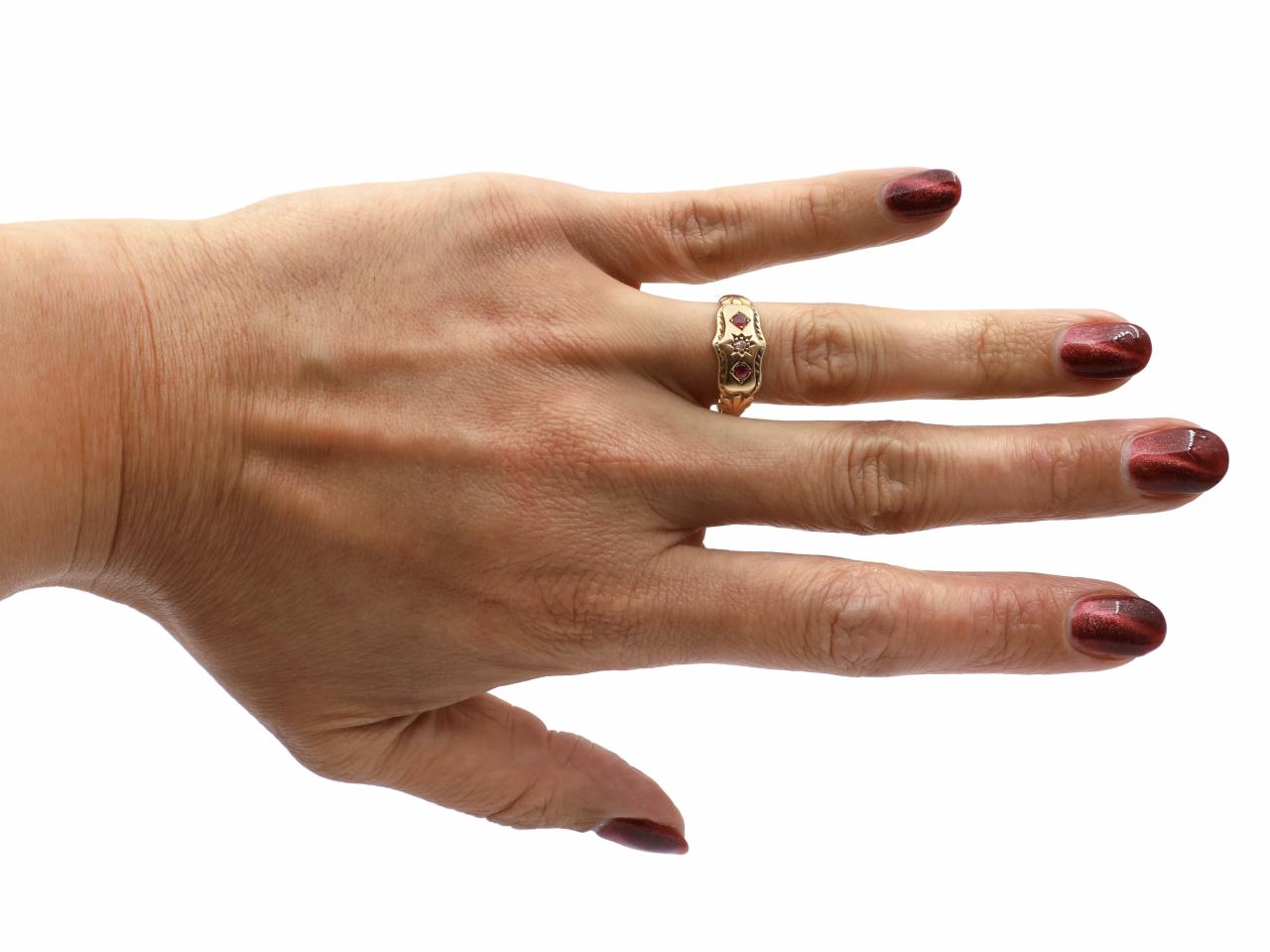 1905 diamond and ruby set gypsy ring in 18kt yellow gold. Centred with a cushion shape Old Mine cut diamond in a star setting, flanked to either side with two cushion shape mixed cut rubies in grain settings, to a three stone design with a polish shield, framed by engraved details and flanked to either side with engraved shoulders which smooth to a solid shank. Hallmarked 18kt gold, Chester, 1905.