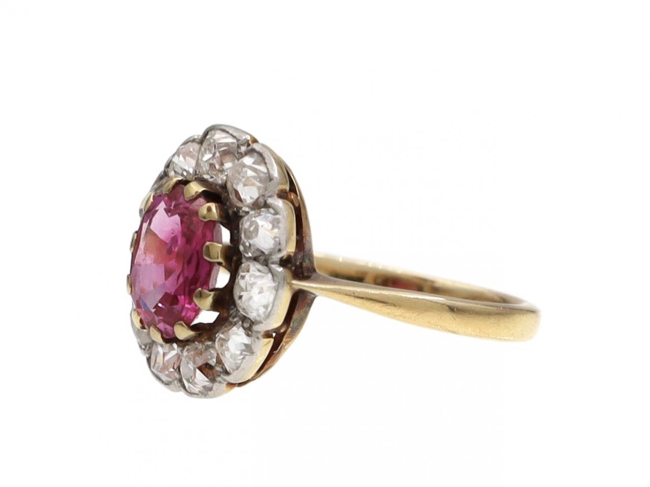 Antique pink sapphire and diamond floral cluster ring in 18kt yellow gold. Centred with an oval mixed cut pink sapphire in a yellow gold claw setting, encircled by a row of cushion shape Old Mine cut diamonds in half rubover and grain settings, to an oval cluster design with curving claws, subtle scalloped edging and pierced open gallery, flanked by raised inwardly tapering shoulders which smooth to a solid shank. Marked 18kt gold.