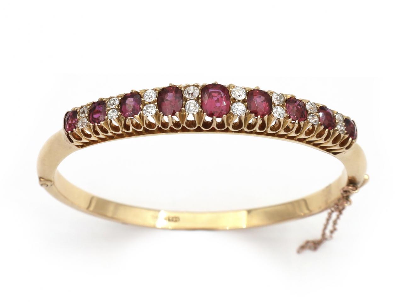 Antique ruby and diamond hinged bangle in 18kt yellow gold. A hinged hollow bangle, fitted to the front with nine cushion shape mixed cut rubies in claw settings, each alternating with two vertically set cushion shape old cut diamonds in claw settings, all to a push clasp mechanism and secure safety chain. Marked 18kt gold.