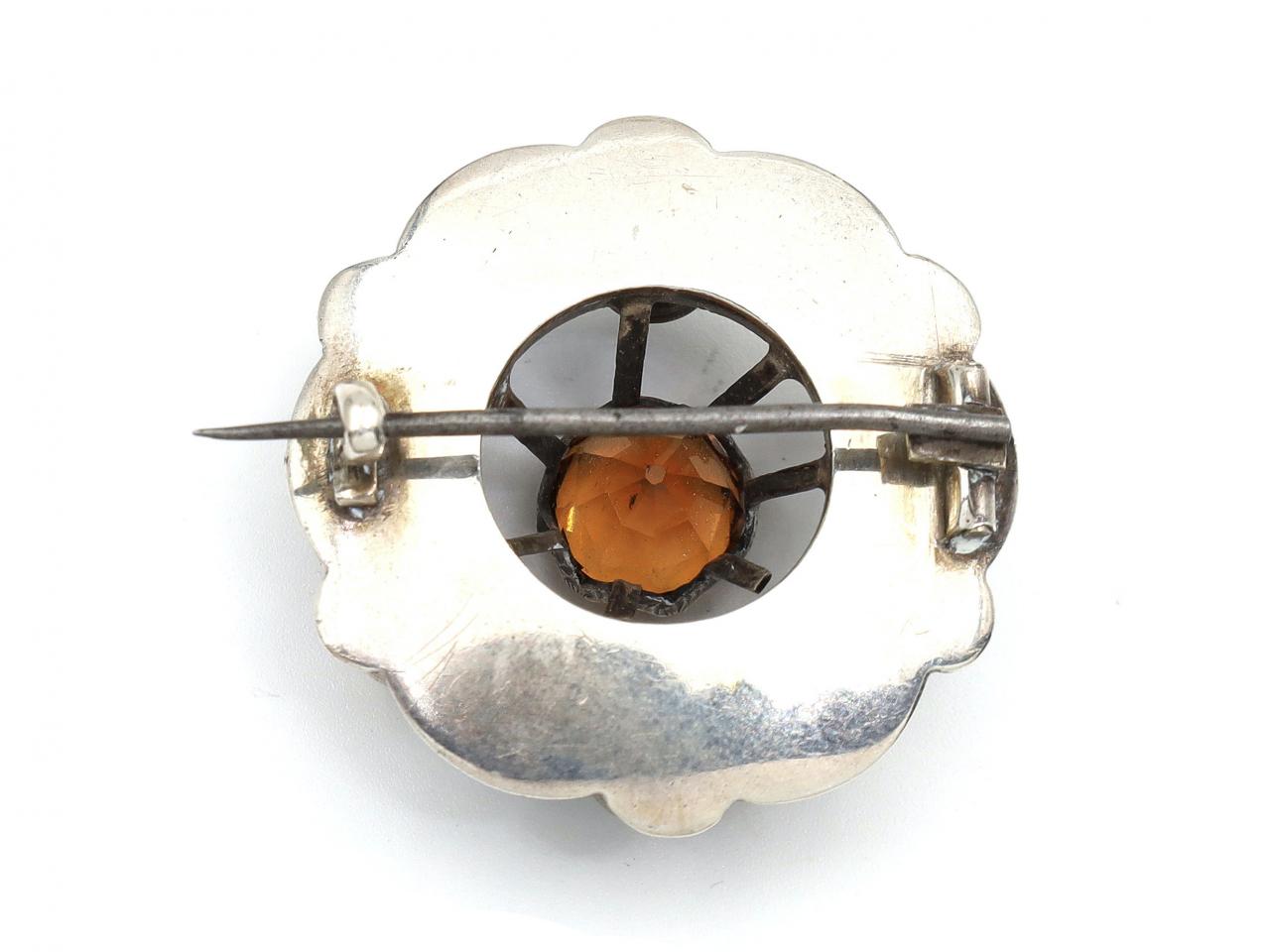 Antique Scottish silver wreath brooch set with bloodstone, carnelian, citrine and foiled back rock crystal, fitted to reverse with a secure hinged pin and C-scroll.