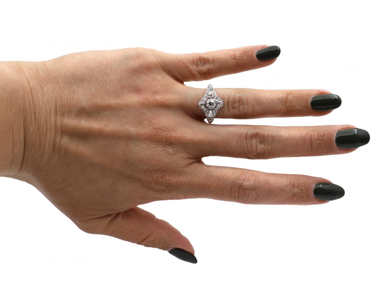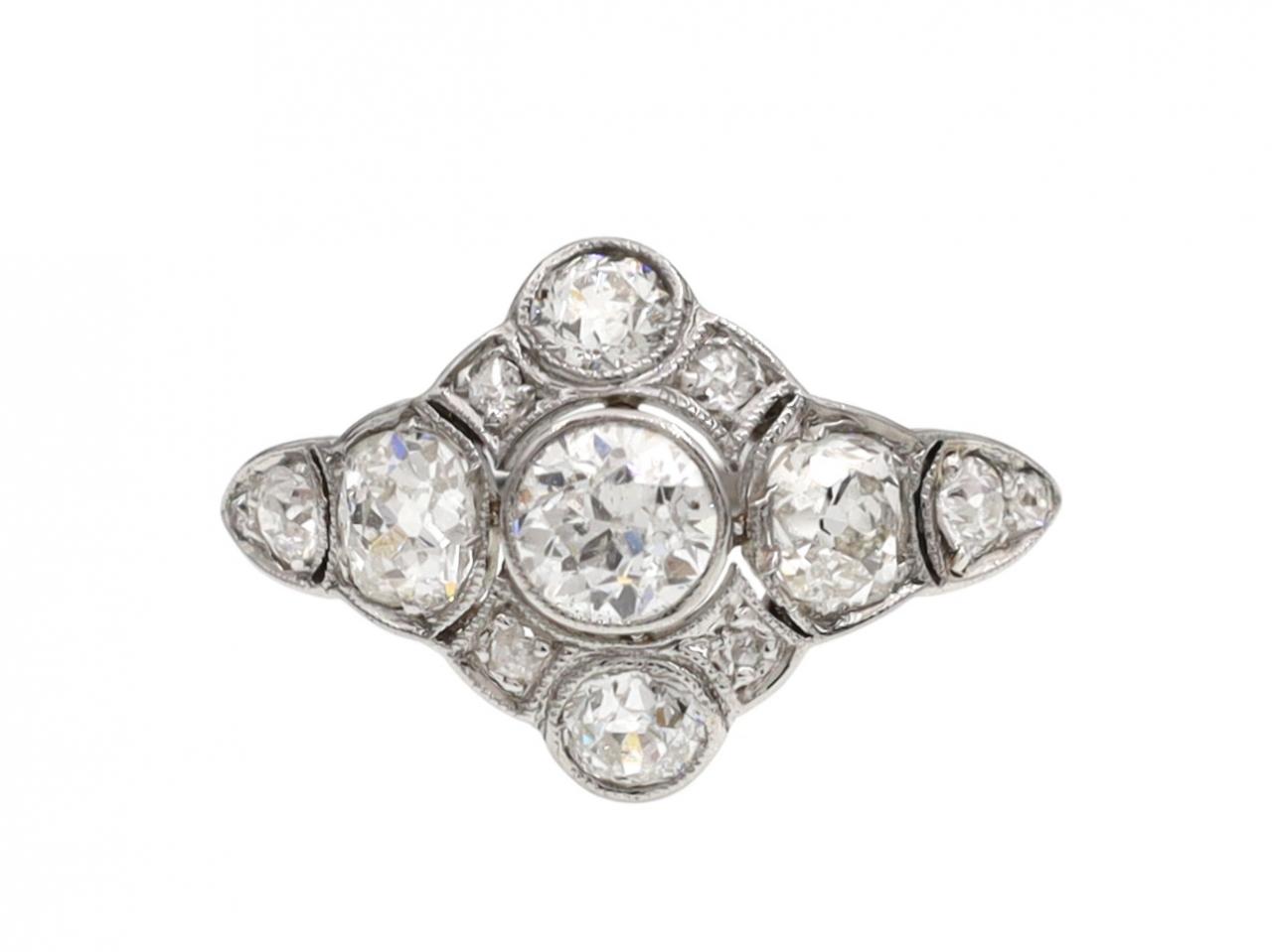 Art Deco diamond openwork bombe cluster ring in platinum. Centrally set with a round Old European cut diamond in a millegrain setting, surrounded by twelve round Old European cut diamonds in grain settings, to a fancy cluster design with pierced openwork terminals, millegrain framing and openwork gallery supported by fine cheniers, flanked to either side with slim shoulders which curve to a solid shank. Marked platinum.
