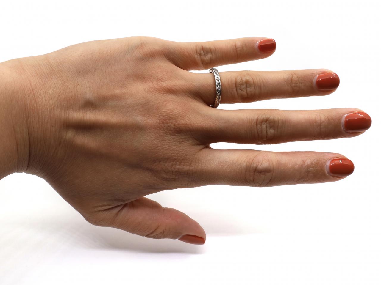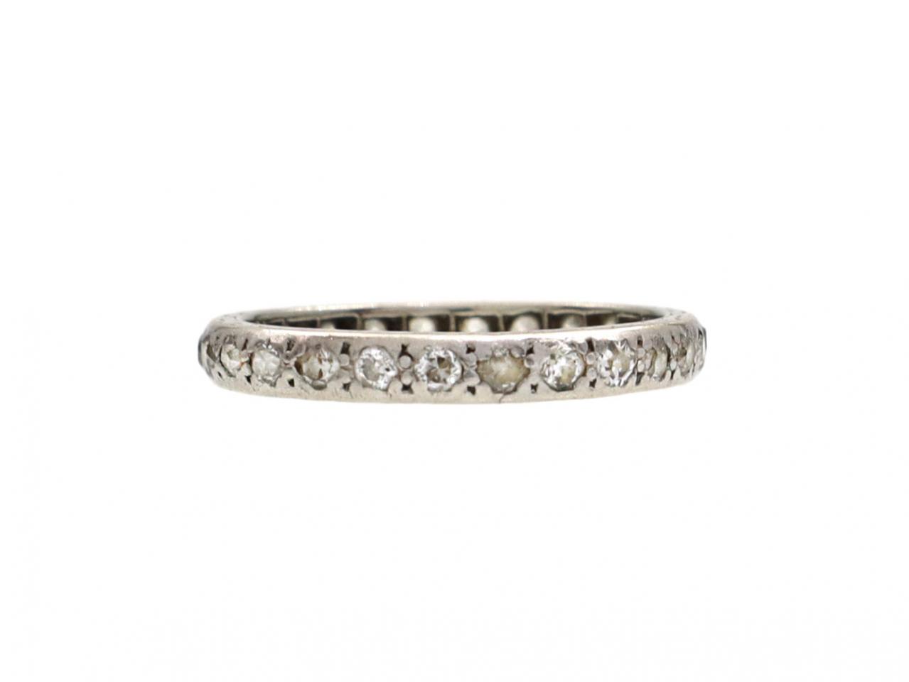 Art Deco diamond set full eternity ring in platinum. Set around the full circumference with round eight cut diamonds in grain settings, decorated to the inner edges with repeating engraved patterns.