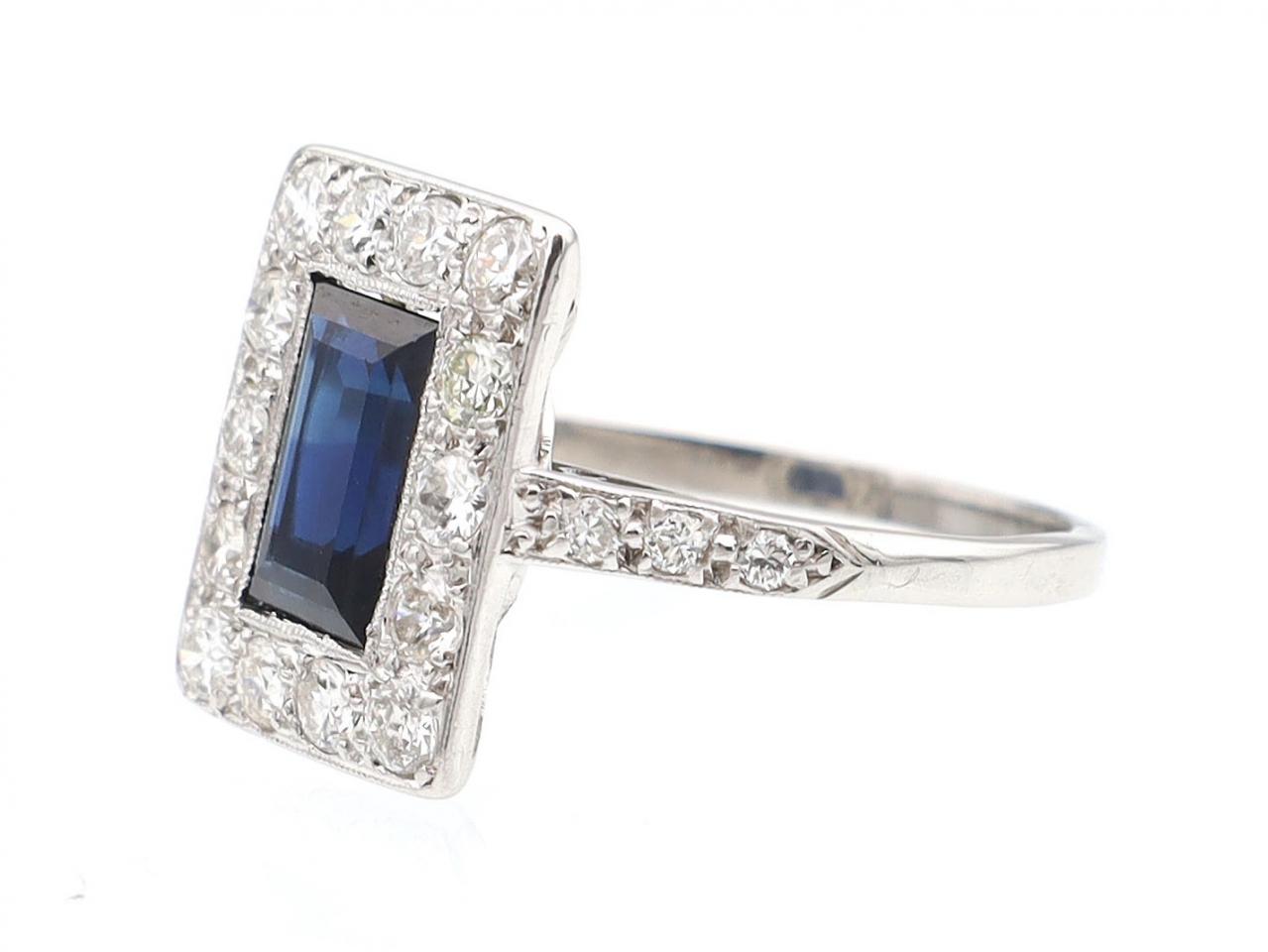 Art Deco sapphire and diamond rectangular cluster ring in platinum. Centred with a rectangular step cut sapphire in a millegrain setting, framed by a row of round Old European cut diamonds in grain settings, bordered by millegrain edging and fitted with a pierced geometric gallery, flanked by diamond set shoulders which terminate to a smooth shank.