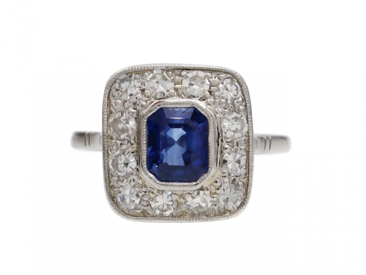Art Deco sapphire and diamond square cluster ring in platinum. Centred with an estimated 0.70ct octagonal emerald cut sapphire in a millegrain setting, bordered by a row of round eight cut diamonds in grain settings, to a rounded edged square cluster design with millegrain edging, scalloped openwork gallery and flanked by raised inwardly tapering shoulders with double incised terminals before smoothing to a solid shank. Estimated total diamond weight 0.35cts. Marked platinum.