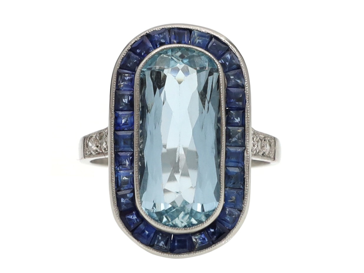Art Deco style aquamarine and sapphire target ring in platinum. Set with an elongated fancy cut aquamarine in a raised millegrain setting, encircled by a row of calibre cut sapphires in channel settings, to a target cluster design with millegrain borders, pierced open gallery and flanked to either side with raised diamond set shoulders which terminate to a solid shank.