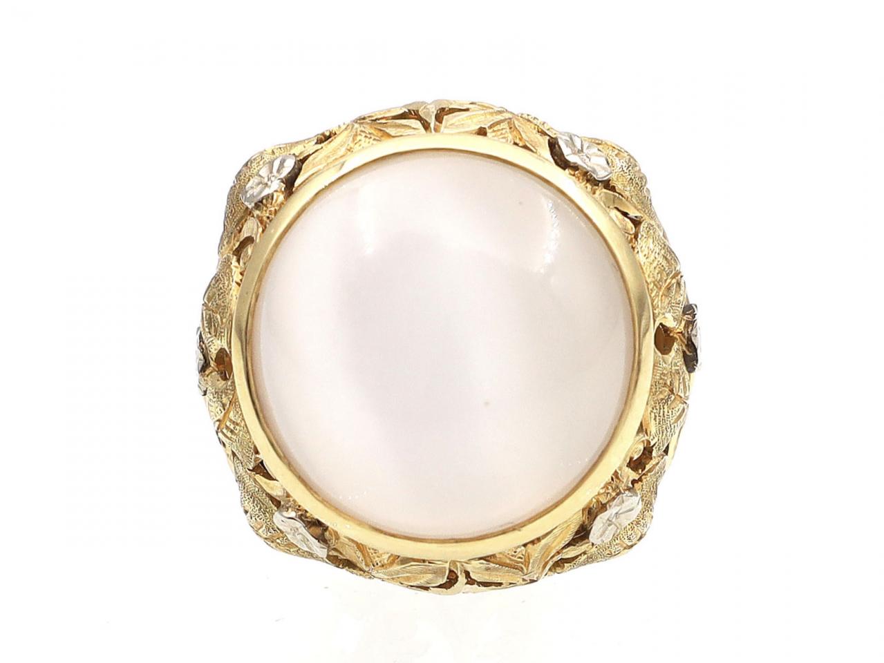 Art Nouveau 18kt yellow gold and moonstone bombe cocktail ring. Set with a round cabochon cut moonstone in a slightly raise rubover setting, to an elaborate surround with intricately carved leaf and white gold floral motifs which terminate to a solid shank. Marked 18kt gold.