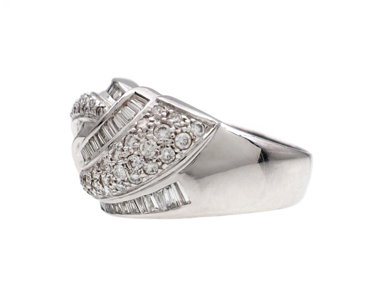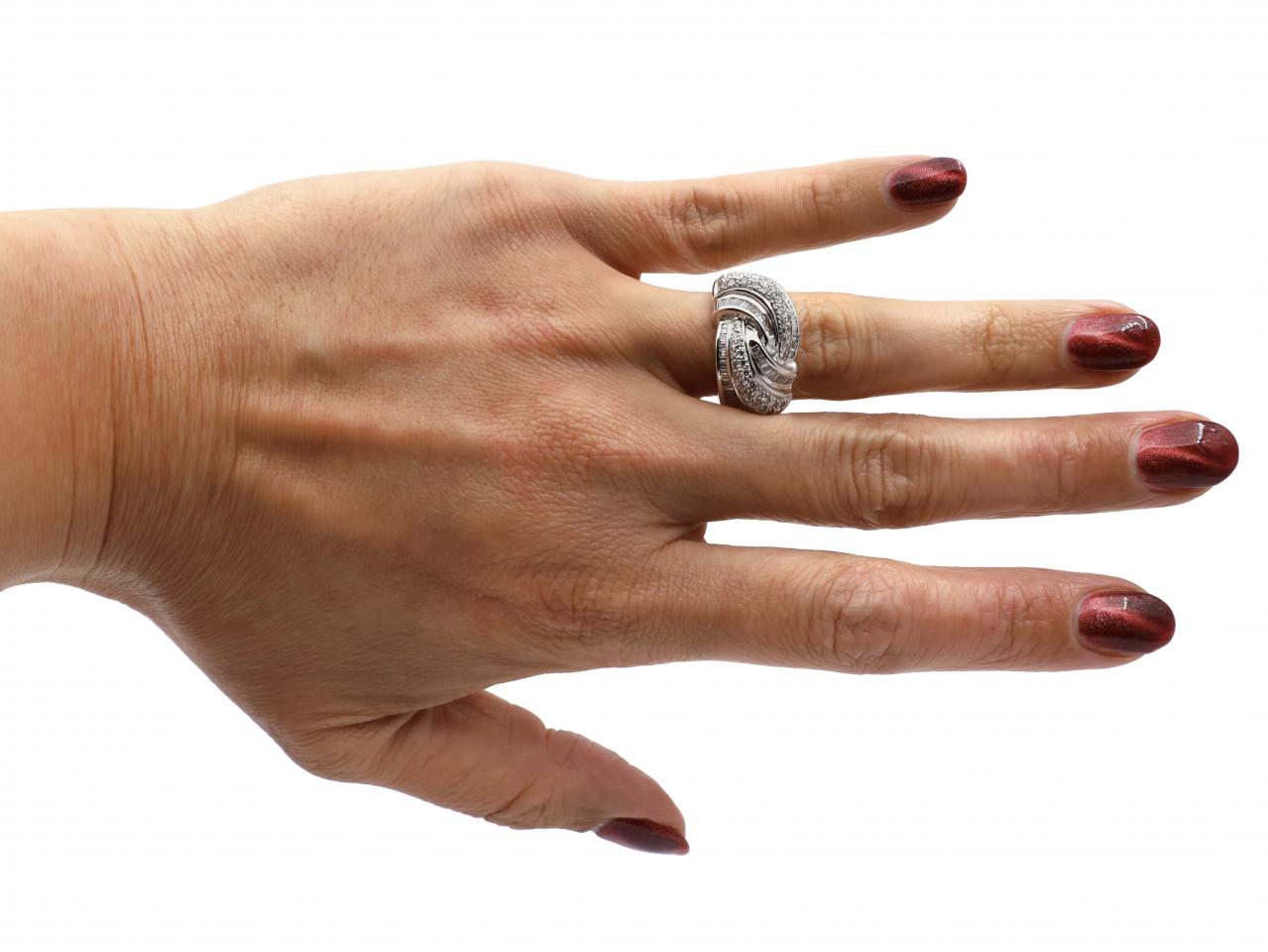 Contemporary diamond set knot ring in 18kt white gold. Set with three swirling sections of pave set round brilliant cut diamonds and channel set rectangular baguette cut diamonds, to a stylised know design with polished borders and gallery, continued to polished integrated shoulders which taper to a solid shank. Marked 18kt gold.