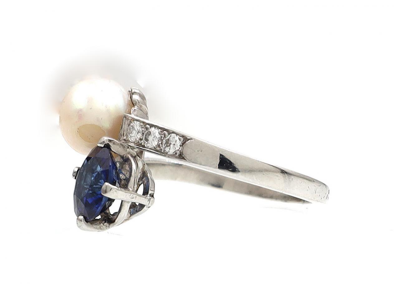 Cultured pearl and sapphire crossover ring in 18kt white gold. Adjacently set with a cultured pearl and a round mixed cut sapphire stylised settings, flanked by twist shoulders set with diamonds and terminating to a smooth shank. Marked 18kt gold.