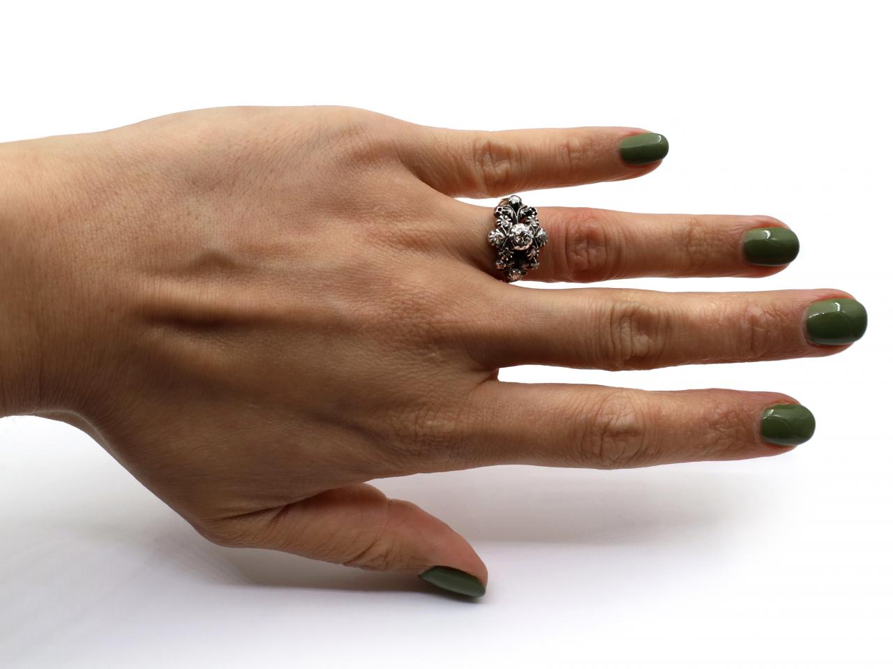 Georgian diamond openwork cluster ring in silver and yellow gold. Centrally set with a round old cut diamond in a silver cut down setting, surrounded sporadically with rose cut diamonds in silver cut down settings, to an elegant openwork cluster with pierced details and flanked to either side with tri-split shoulders that curve to a solid shank.