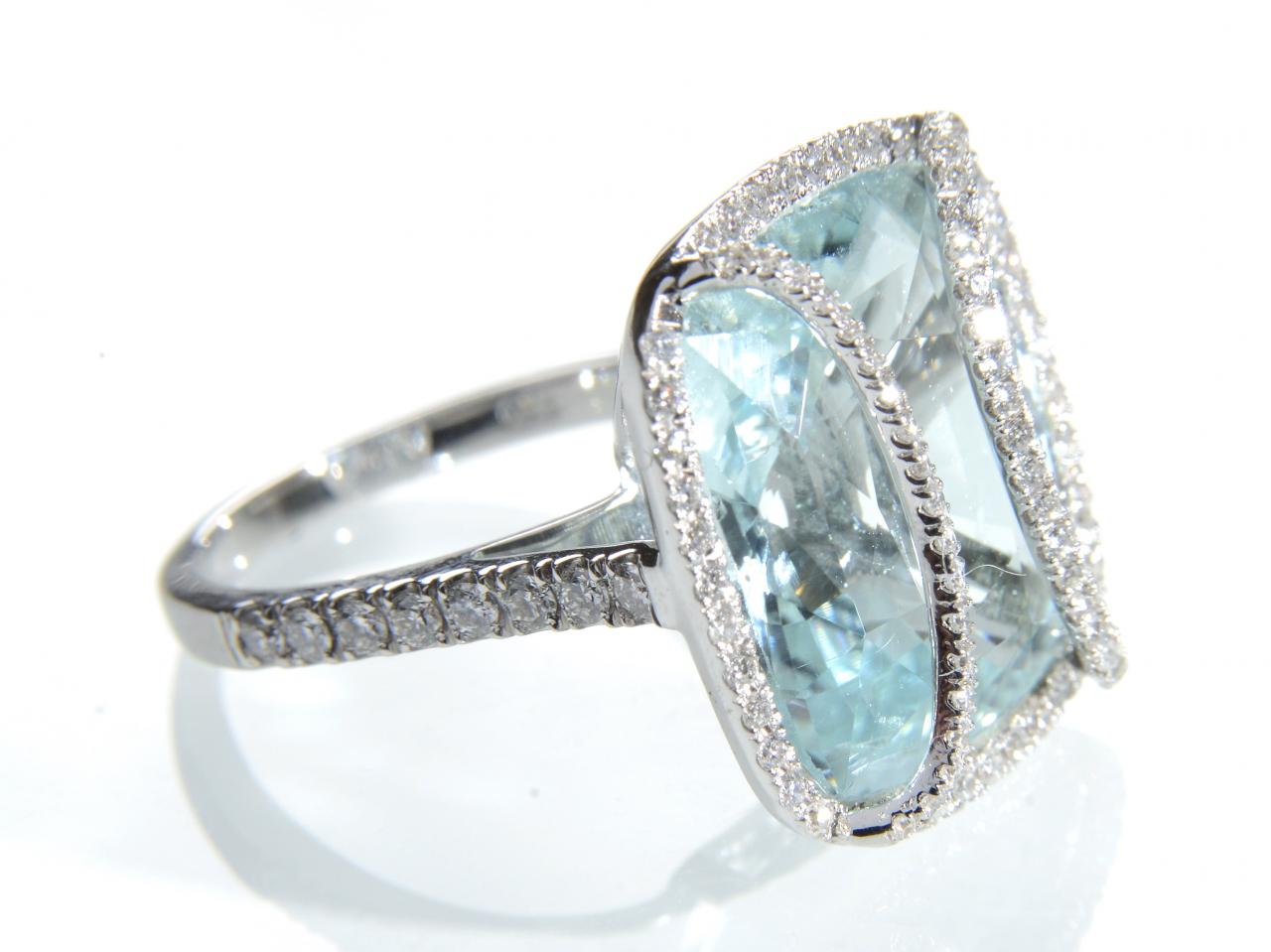 Modern aquamarine and diamond cocktail ring in 18kt white gold, set with a cushion shape fancy cut aquamarine in a grain setting, surrounded and flanked by round brilliant cut diamonds in pave settings, to a large cocktail ring with two curved diamond set panels sweeping over the centre of the stone, flanked by raised diamond set shoulders which terminate to a solid shank. Estimated total diamond weight 1.00cts.