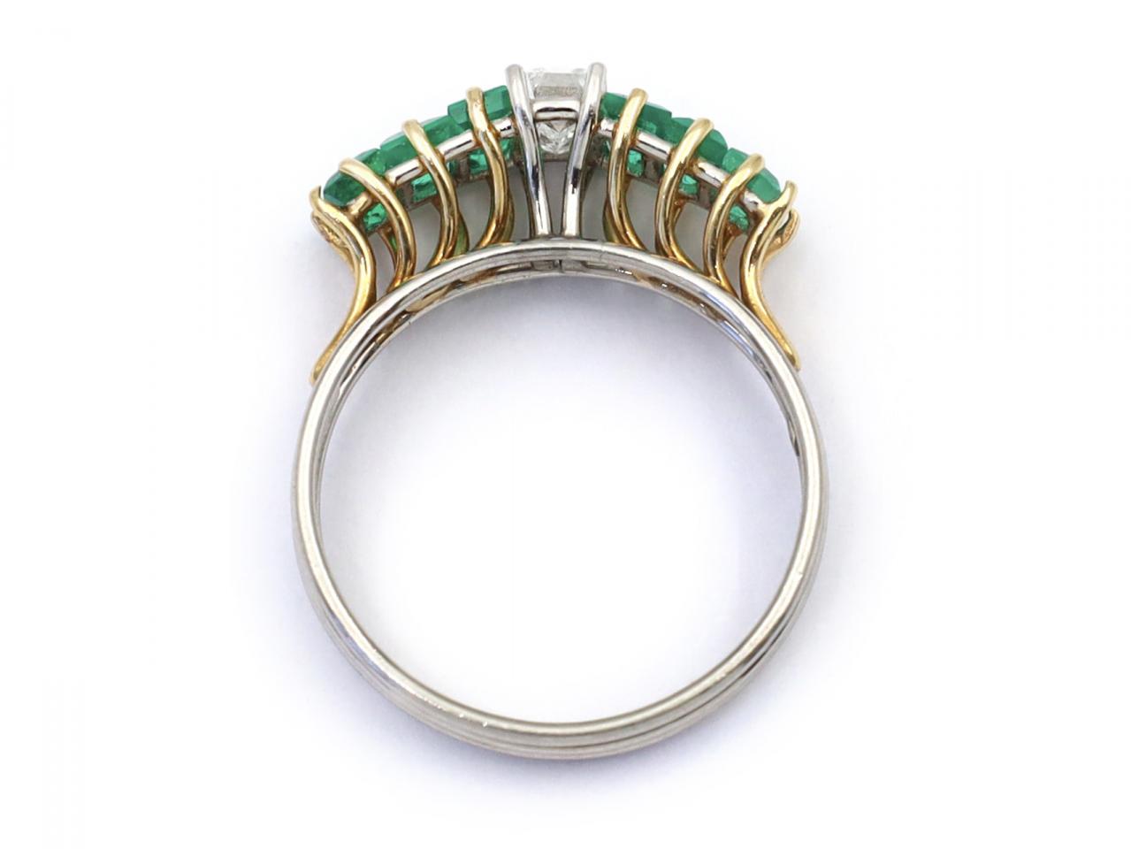 Retro emerald cut diamond and emerald seven stone ring in 18kt yellow gold and platinum. Centred with an estimated 0.30ct rectangular emerald cut diamond in a raised platinum four claw setting, flanked to either side with six rectangular step cut emeralds in raised yellow gold claw settings, to a graduating seven stone design with high bespoke settings, supported by a linear gallery and fitted to a four ribbed shank. Estimated total emerald weight 0.60cts.