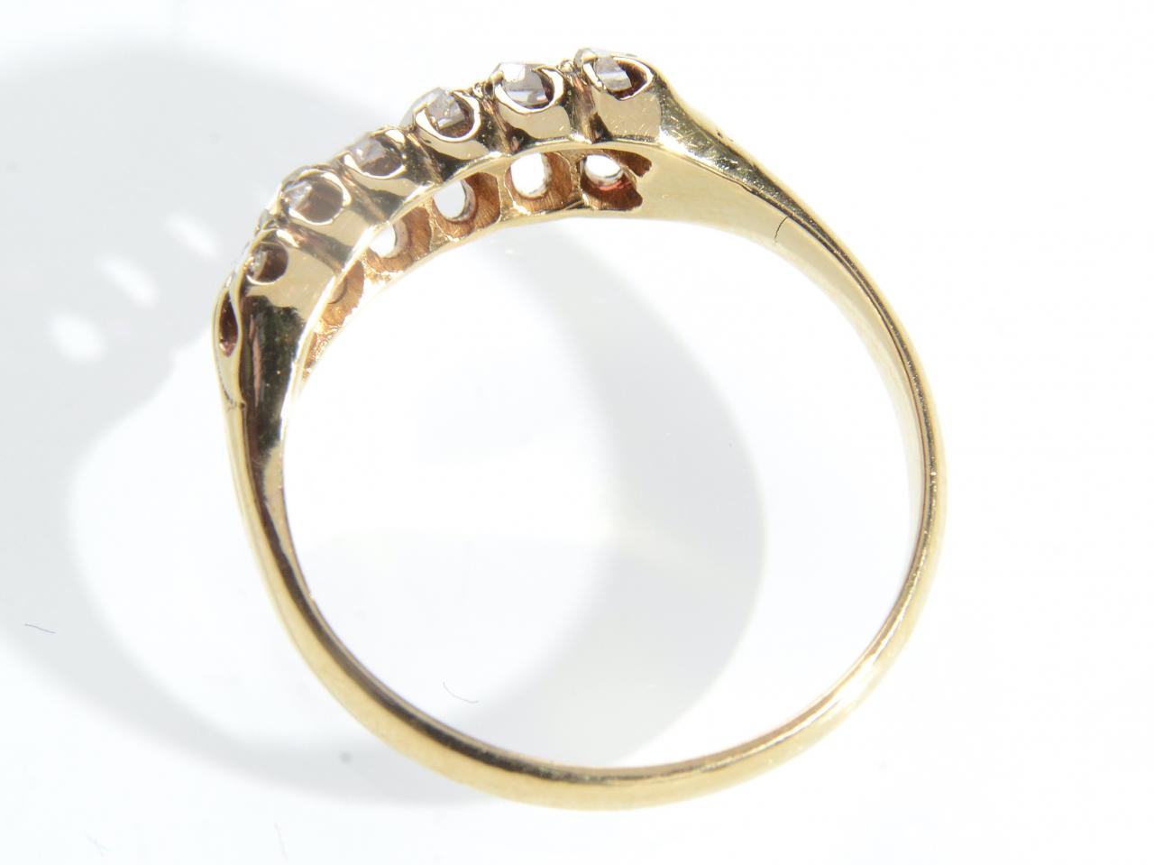 Edwardian diamond and ruby gypsy ring in 18kt gold, set to top with a row of round rose cut diamonds in claws settings, set to bottom with a row of round mixed cut rubies in claw settings, flanked by trumpeting shoulders which smooth to a solid shank. Marked 18kt gold, Birmingham, 1875.