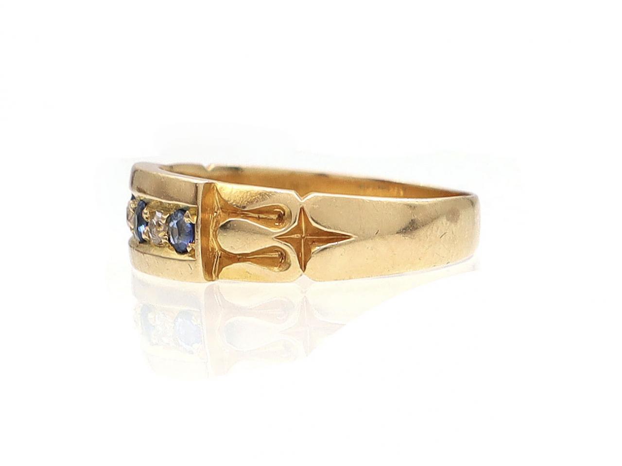 Victorian sapphire and diamond five stone ring in 18kt yellow gold. Set with three oval mixed cut sapphires in grain settings, alternating with two round old cut diamonds in grain settings, to a rectangular central plaque with polished linear borders to top and bottom, met to either side with elaborately carved shoulders which terminate to a solid shank. Marked 18kt gold, Birmingham, 1903.