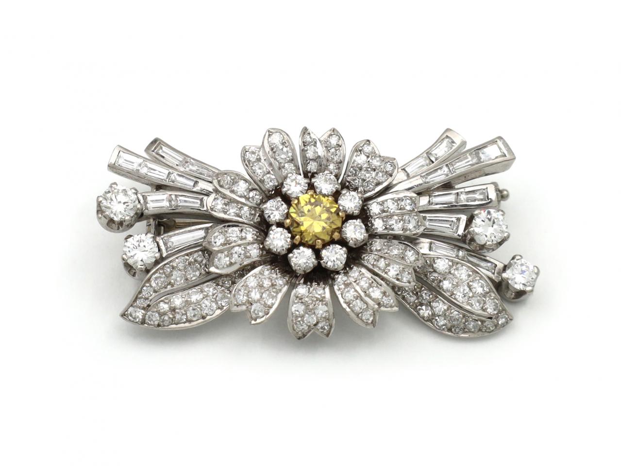 Vintage 1950s fancy yellow diamond and diamond flower brooch in platinum. Centred with an estimated 0.50ct round brilliant cut fancy yellow diamond in a raised claw setting, surrounded and flanked by round brilliant cut diamonds in grain and claw settings and rectangular baguette cut diamonds in channel settings, to a floral motif complete with detailed scalloped petals, openwork leaves and sprawling foliate motifs, fitted to the reverse with a secure hinged pin and safety latch. Marked 18kt gold.