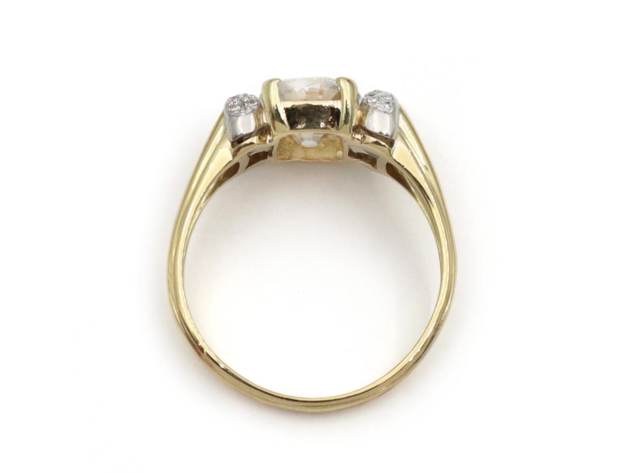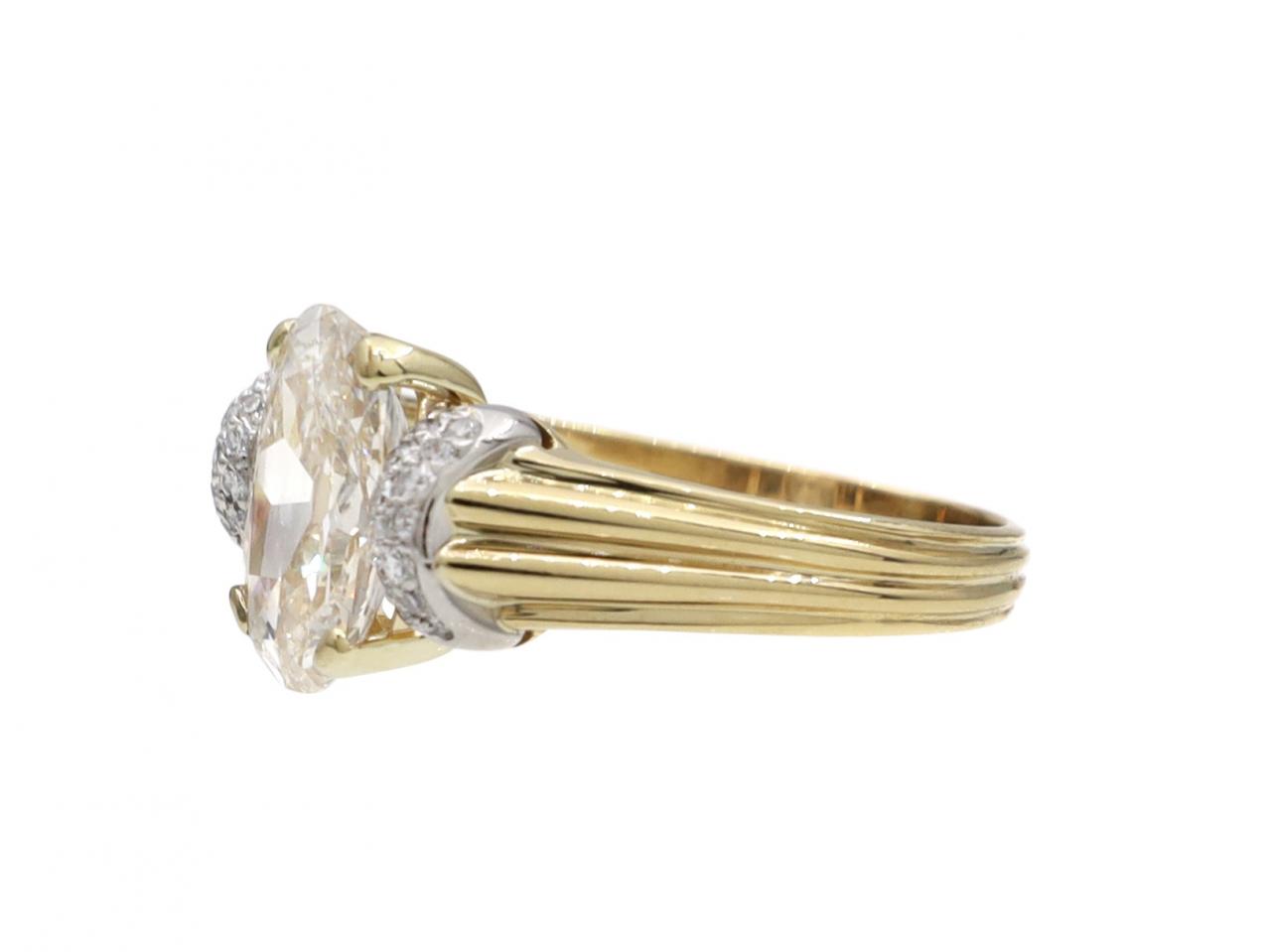 Vintage 2.22ct oval Old Mine cut diamond solitaire engagement ring in 18kt yellow gold. Centred with a 2.22ct oval Old Mine cut diamond, K colour, VS2 clarity in a four claw setting met to either side with semi-circular diamond set terminals and flanked by broad ribbed trumpeting shoulders which taper to a solid shank. Marked 18kt gold. Accompanied by HRD Antwerp certificate.