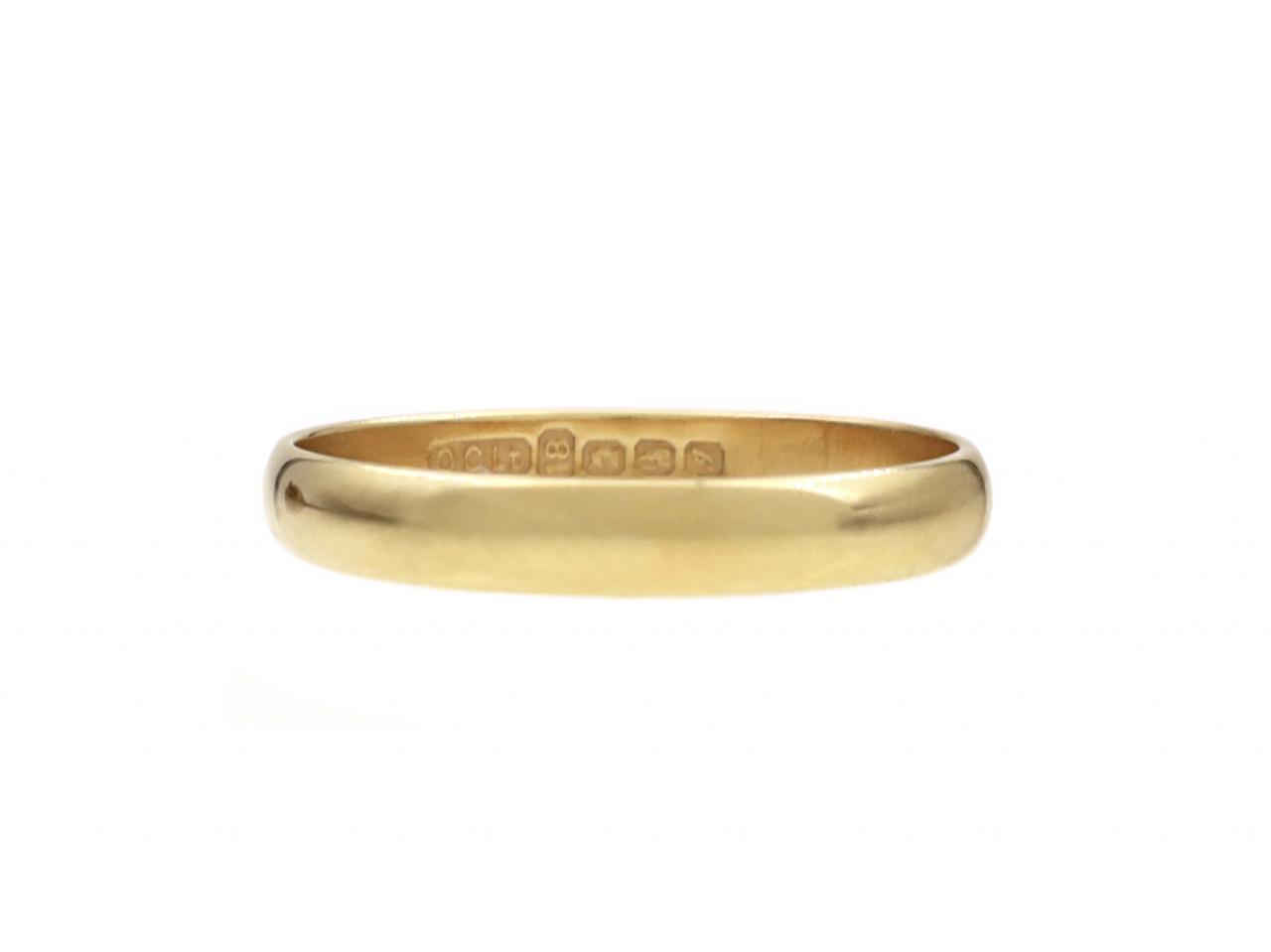 Vintage 2.9mm polished D-shape wedding band in 18kt yellow gold. Hallmarked 18kt gold, Dublin, 1995.