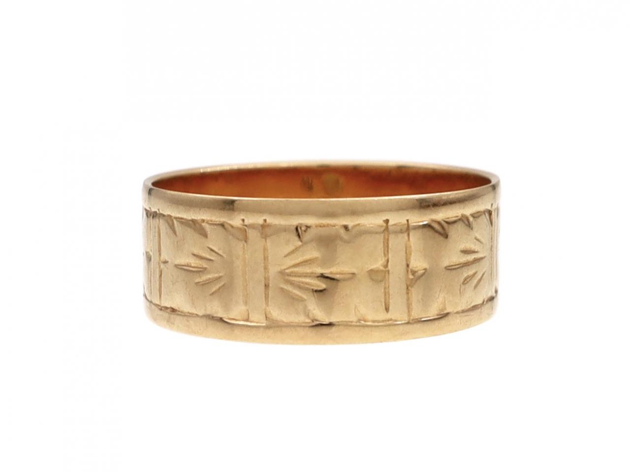 Vintage 6.7mm 'Ivy leaf' wedding ring in 18kt yellow gold. A flat 6.7mm wide wedding band, decorated around the full circumference with a repeating engraved ivy leaf motif. Marked 18kt gold.