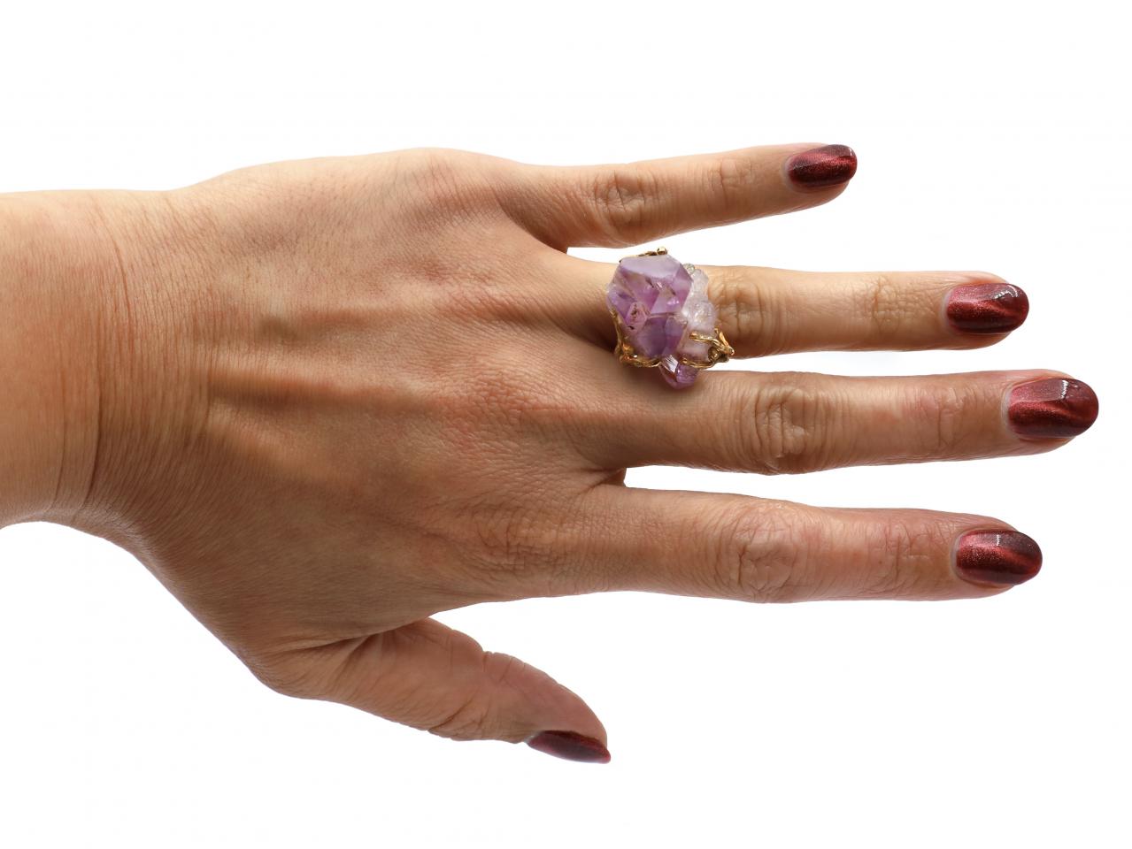 Vintage amethyst geode crystal dress ring in 18kt yellow gold. Hallmarked 18kt gold, French.