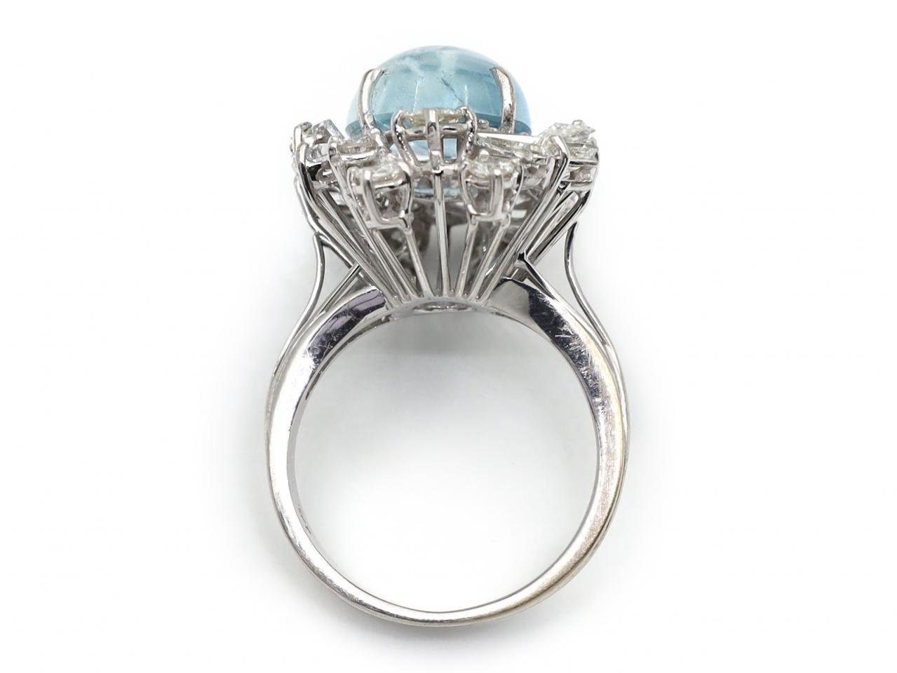 Vintage cabochon aquamarine and diamond fancy cluster ring in 18kt white gold. Centrally set with an oval cabochon cut aquamarine in a raised four claw setting, encircled by tapering baguette and round brilliant cut diamonds in clawq settings, to a vertical cluster design with curving claws, radiating linear gallery and and raised split open shoulders which join to a ribbed shank. Estimated total diamond weight 2.50cts. Marked 18kt gold.