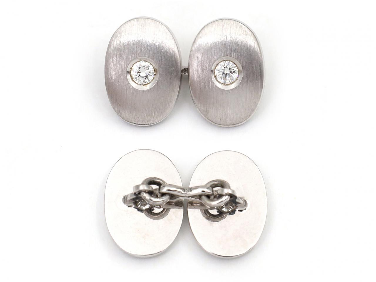 Vintage double oval diamond set cufflinks in platinum. A matching pair of cufflinks, each consisting of double oval shields centrally set with a round brilliant cut diamonds in a rubover settings with a textured matte finish and connected to the reverse with a custom link. Marked platinum, Italian.